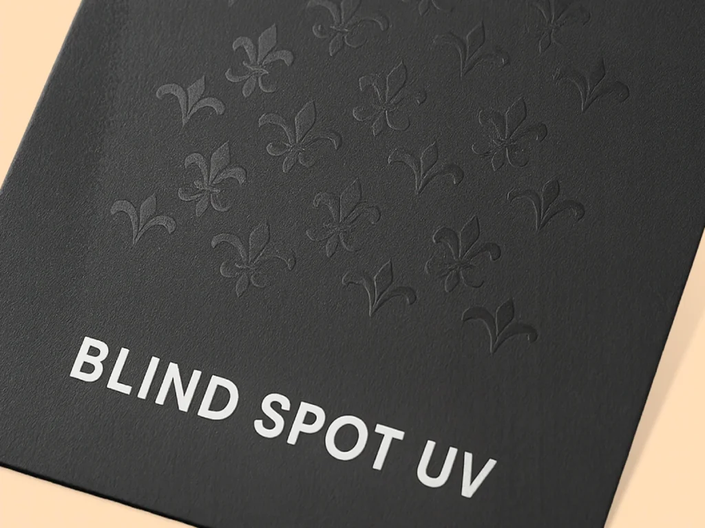 Blind spot UV: This is a subtle effect where the UV gloss is applied to an area with no ink underneath. It creates a hidden pattern that is only visible when light hits it at the right angle, adding a touch of high class.